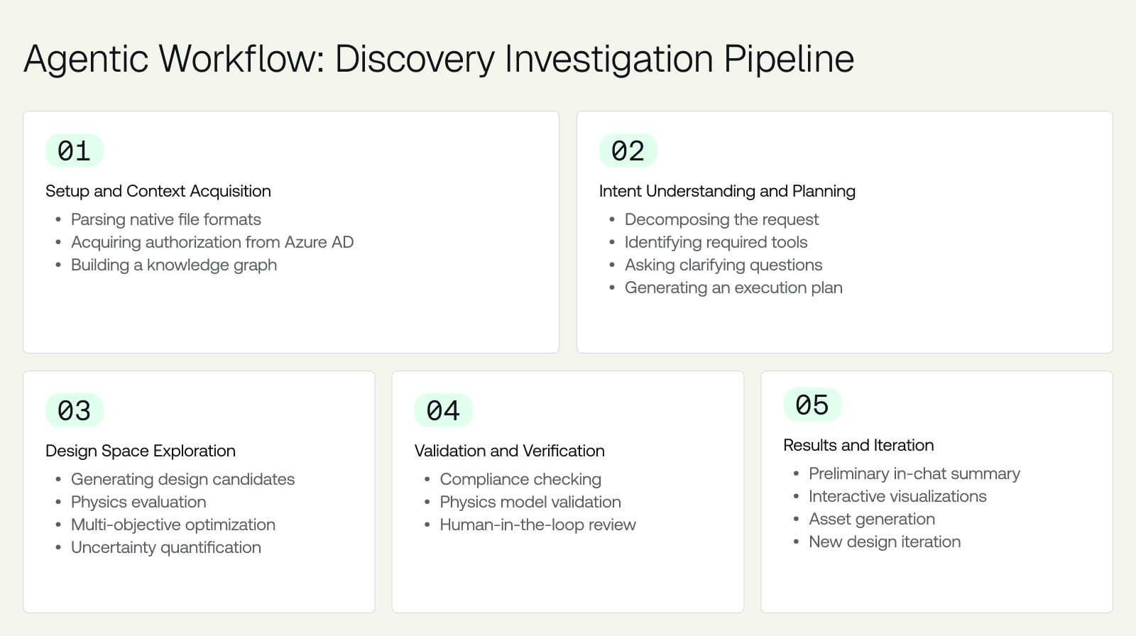 - Automated compliance checking: Microsoft Discovery agents continuously check designs against organizational standards encoded in the knowledge graph. Ambiguities are flagged for human review; straightforward issues are auto-corrected.